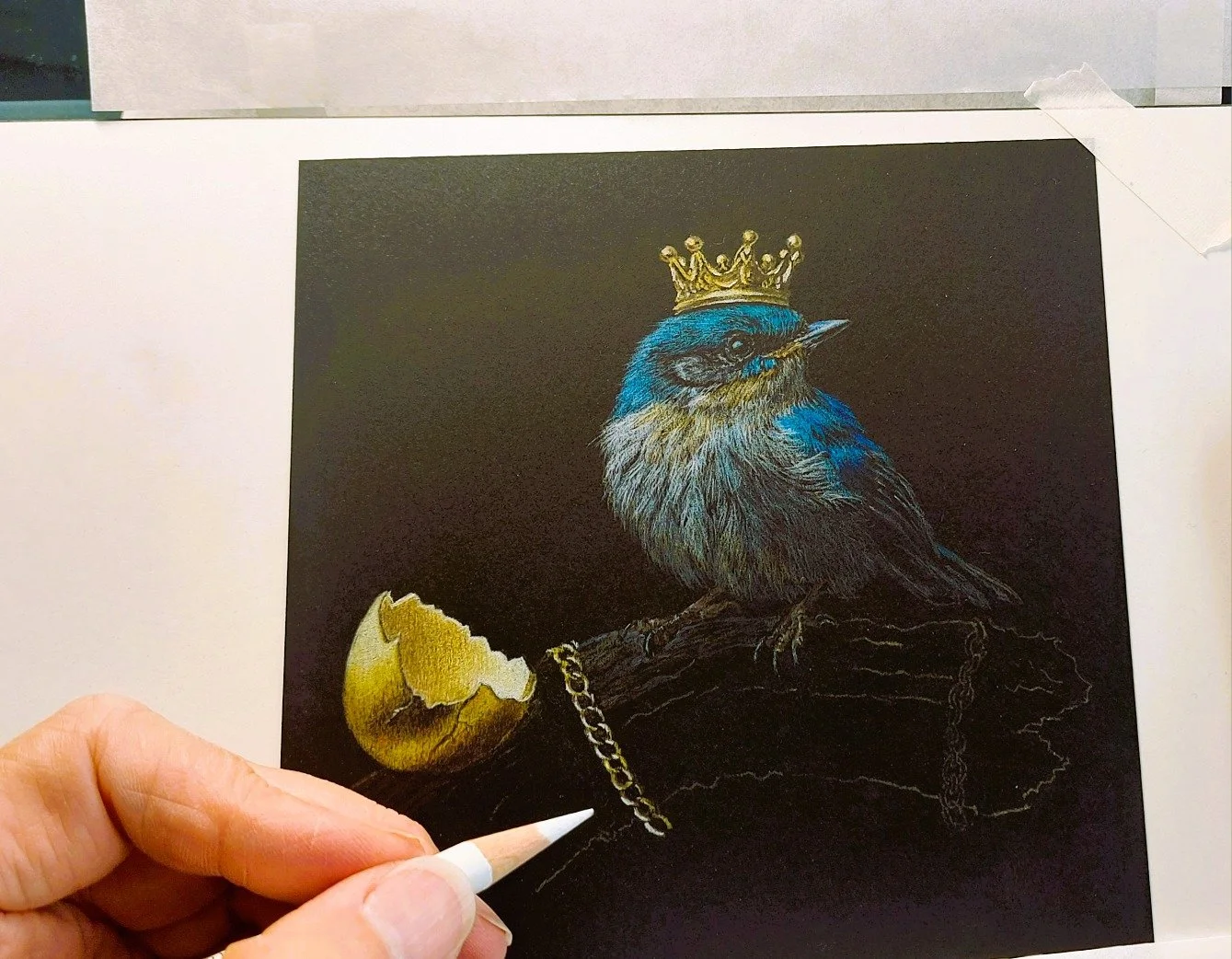 Her current series, The Oracle of Feathers, features crowned birds and layered symbolic forms rendered in luminous detail with touches of metallic accent. Each piece carries a quiet presence and an intimate sense of depth, inviting viewers into reflection and personal meaning.