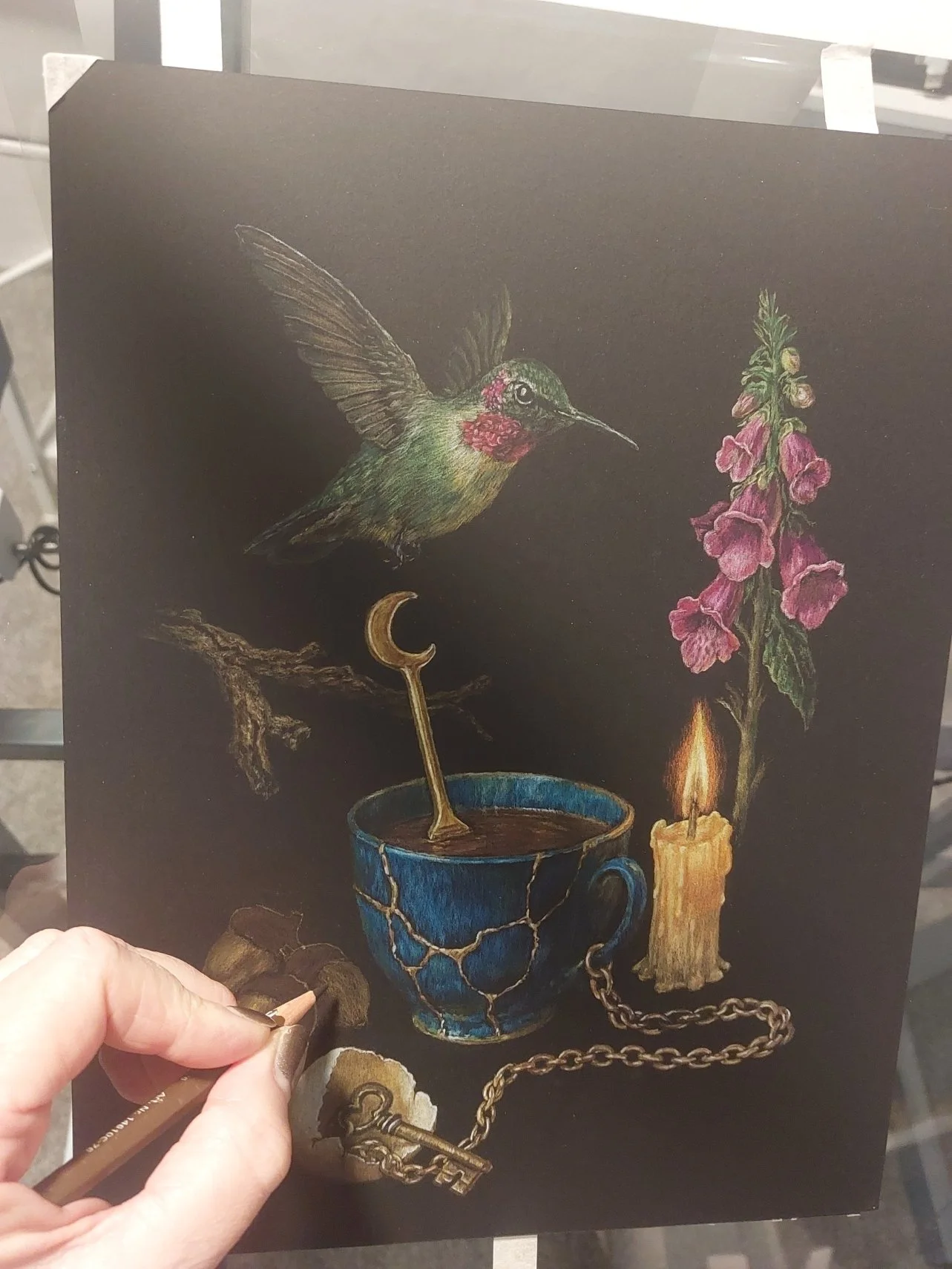 Kim Kelley is a visual artist based in rural Oregon. She works primarily in colored pencil, creating symbolic and atmospheric drawings rooted in lived experience, ancestral dialogue, and the quiet mysteries of everyday life. Her work centers on bird imagery and subtle narrative motifs, exploring themes of transformation, continuity, and inner sovereignty.